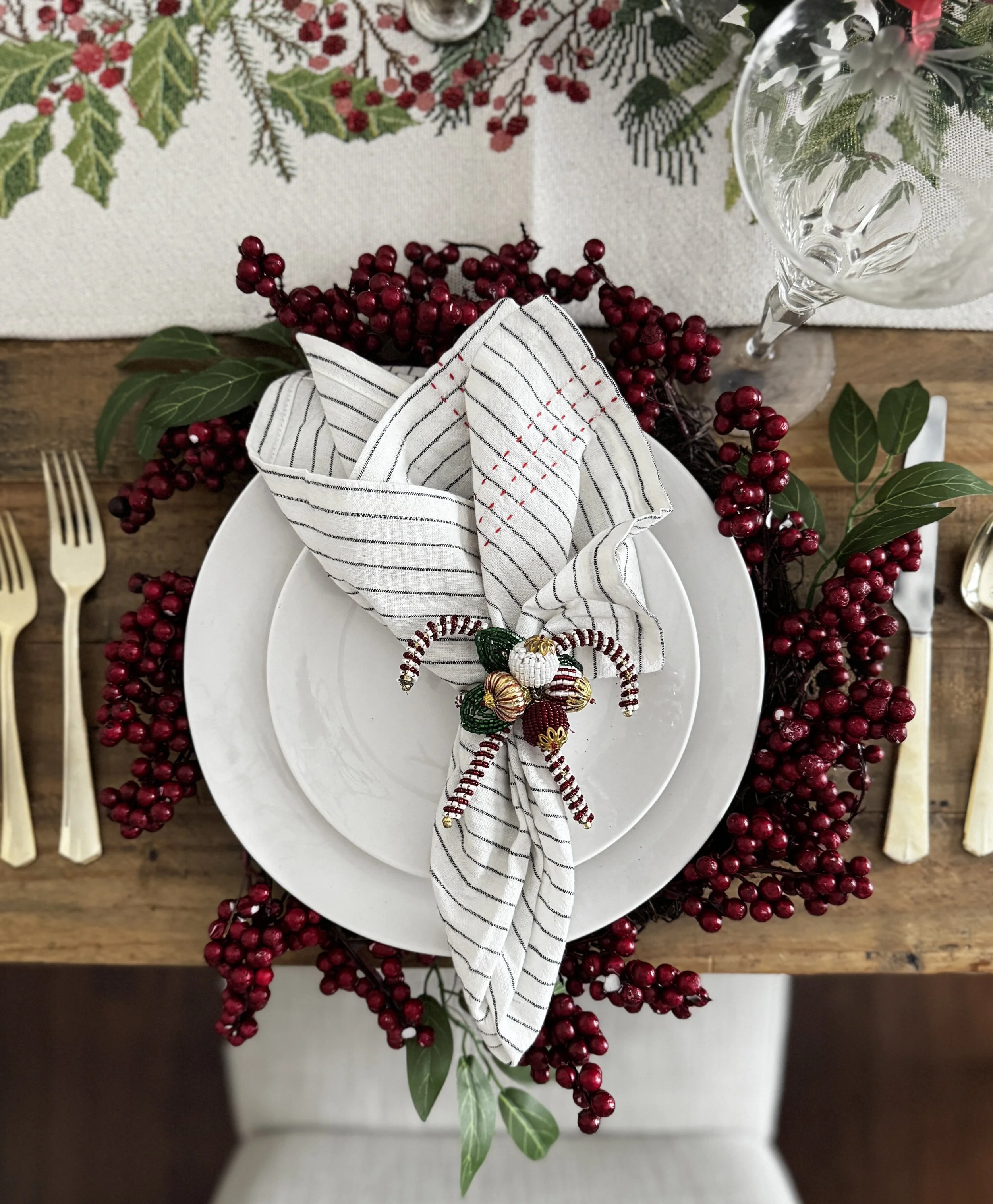 While shopping for Christmas ornaments, I came across a beautiful winter berry wreath, which paired perfectly with my holly table runner. I added the white plates on top of the wreath, then layered in gold flatware and candy cane napkin rings. The best surprise? The champagne flutes that I’ve had forever had an etched holly on them; perfectly bringing the holly theme front and center.